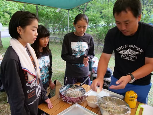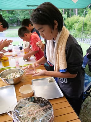 キャンプ場に戻るともう夕方。夕食も休養日恒例の「皮から作る餃子」です。加えて今回は、昨日の大内宿でアユトが大ハマりした「五平餅」も作ることに。休養日とは言え一日中動き回っていた子供達もよほどお腹が空いていたのでしょう、大量の餃子も五平餅も、あっという間になくなりました。