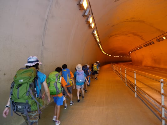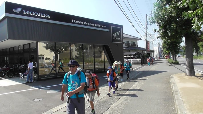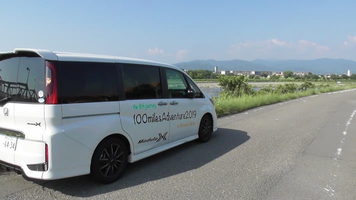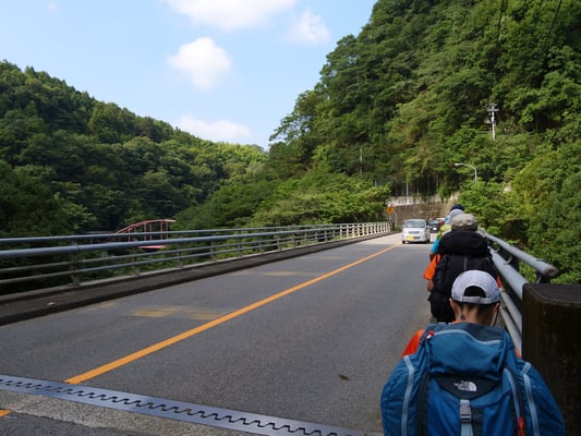 この日の行程は前日のゴール「せせらぎ公園」からセンターまで。前日に予定よりも距離を稼げたことで、進行距離は約18km。しかしながら歩道が狭く、見通しの悪いルートが続くため、荻田ひとりが10mほど前を先導し、その後を隊が続くと言う形で進行して行きました。国道317号線を南下し、比較的歩道の広いルートまで下りると、今度は荻田が最後尾に付いて進行すると言う、この旅初めての隊列を取りました。