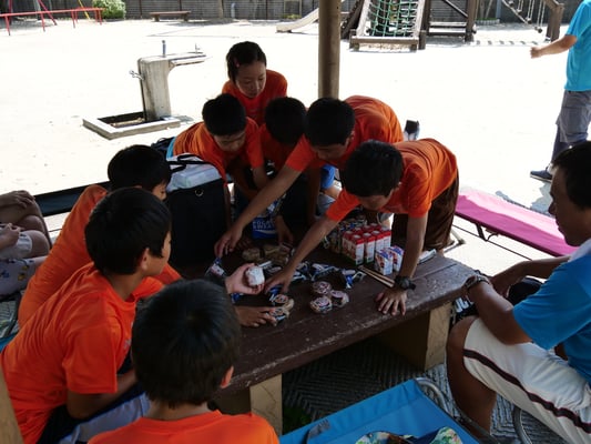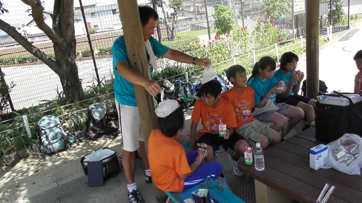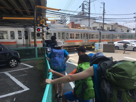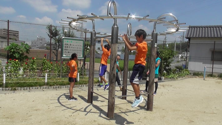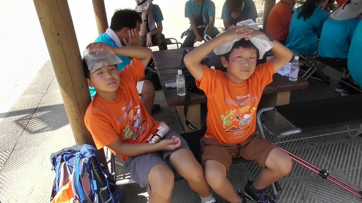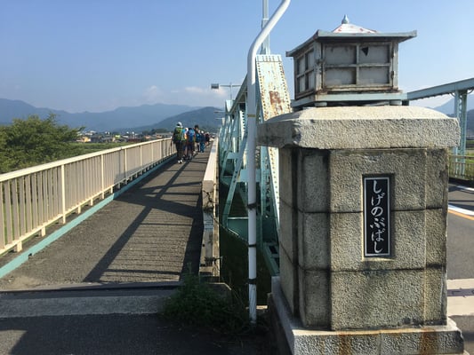 前日に21kmを全員で踏破出来たとは言え、歩き始めてからの日も浅く、まだまだリズムの掴めないメンバーもいます。予定よりも少し遅れた13時過ぎ、昼食場所である「天山公園」に到着。照りつける太陽から逃れ、クールダウンに努めました。と思いきや、遊び出すメンバー達と昔子供だった人達。彼らの体力には脱帽です。