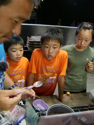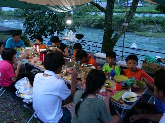 ひとしきり遊んだ後は、キャンプ場へ。すぐ傍に仁淀川が流れる最高の環境で、最後のテント泊の一夜を過ごします。辺りでは昆虫採集をしている家族もおり、メンバーのソウマが興味津々。手作りの「虫寄せ蜜」を作製し、準備OK。果たして、結果はいかに?
