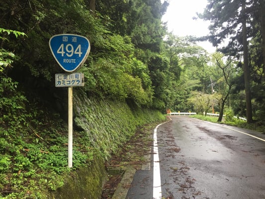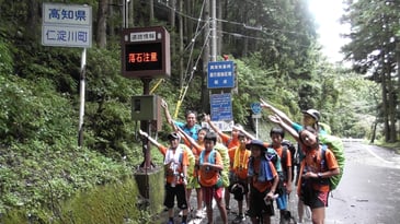 起床時に音を立てて降っていた雨も、出発時には小降りに。レインウェアは着ることなく、前日のゴール地点へ向かいました。高知・仁淀川方面へ向かうこのルートは、車1台が通るのもやっとなくらいの道幅であるため、この日のサポートカーによる伴走は断念。その分スタートの時点で必要な水等を全て用意し、持って行くことになりました。更にメンバーのシュンスケもこれをお手伝い。2Lのペットボトルをザックに詰め、頑張って運んでくれました。