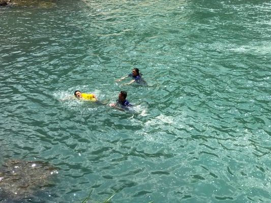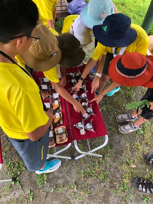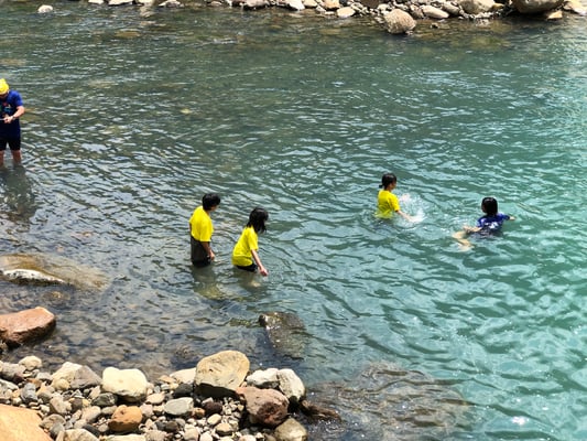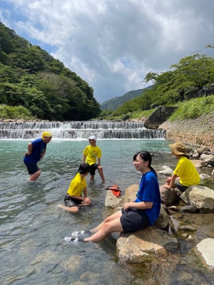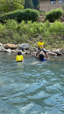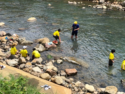 スタートから続いた登り坂も昼前には下り坂に。12時半頃には本日の昼食休憩場所の「上河原公園」に到着しました。水を見ると、どうしても入りたくなるのでしょう。昼食後は公園の下を流れる川に飛び込み、暑さで疲労した身体を冷やしました。