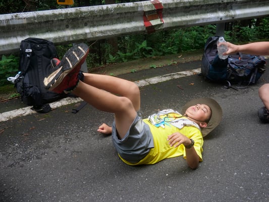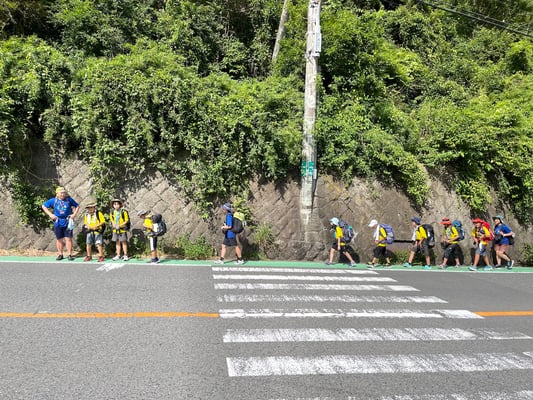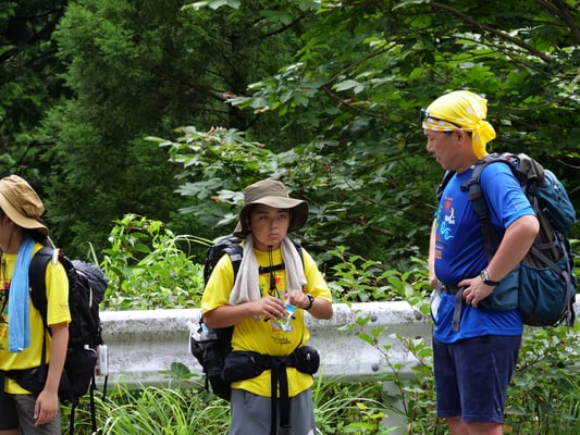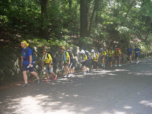 本日のルートは箱根・乙女峠を越えてキャンプ場までの約24km。実は昨年の3日目と、ほぼ同じルートを辿ることになります。夜中降り続いた雨も朝には止んでいましたが、湿度も高く、あまり良いコンディションとは言えません。さらに開始直後からダラダラとした登り坂がひたすら続き、メンバーたちの体力を奪いました。また峠道は歩道の無い、狭い箇所も多数有るため、細心の注意を払いながら進行して行きました。
