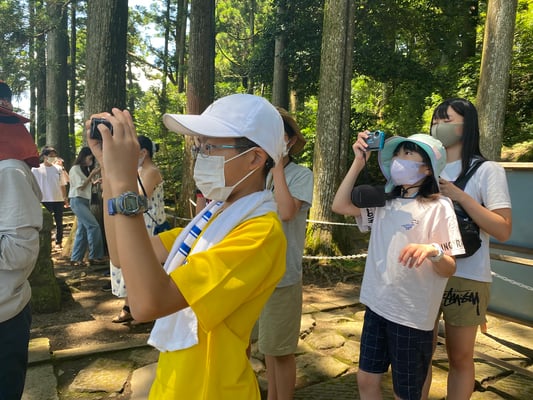 次に向かったのは「箱根神社」。湖上の「平和の鳥居」前で記念撮影をした後、本殿を全員で参拝し、旅の無事と成功を祈念しました。