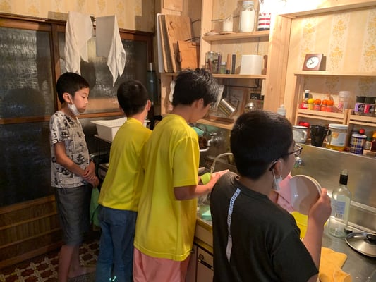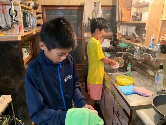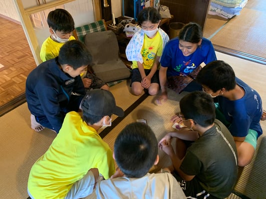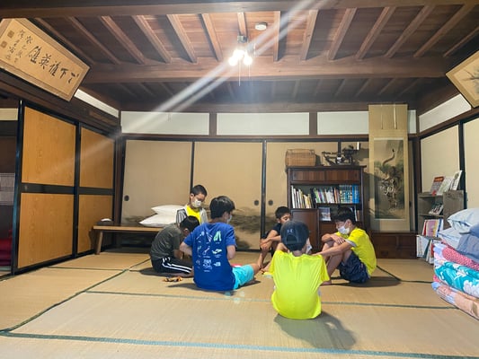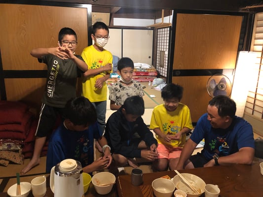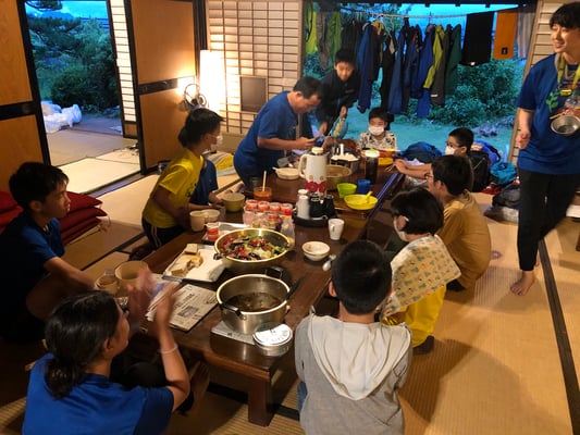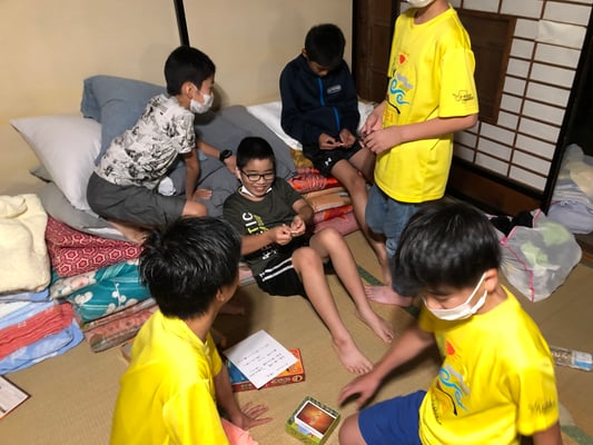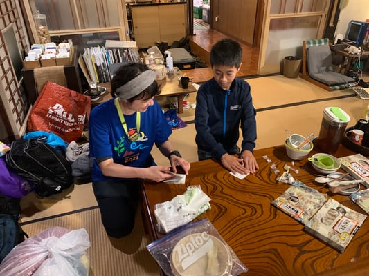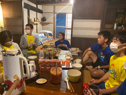 おみやどさん到着後は、完全な自由時間。今日で3日目となる第2ルートですが、初日、2日目とテント待機の時間が長く、全員が顔を合わせることも食事の時くらいしかありませんでした。しかし一つ屋根の下で喋り、遊び、食事をする13人の姿は大家族さながら。朝から困難の多い1日でしたが、おみやどさんのおかげで大変有意義な時間を持つことができました。