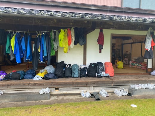 宿が決まり、ホッとしたのも束の間、2日間使用したキャンプ道具一式を、この大雨の中で撤収しなければなりません。メンバー達を管理棟に待機させ、こちらもスタッフ総出で一気に片付け。ずぶ濡れのまま車に乗り込み、一路おみやどさんへ向かいました。