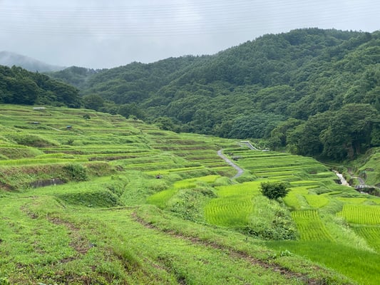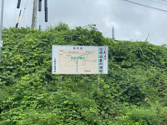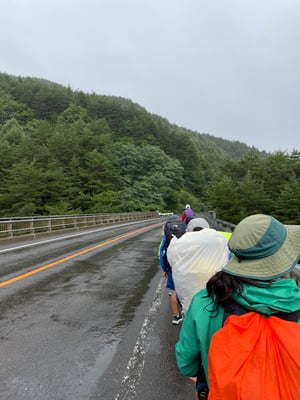 5日目のスタート予定地点から程近い「稲倉の棚田」近辺から徒歩行開始。菅平方面に歩みを進めて行きます。急な予定変更を余儀なくされた結果、この時点で時刻は正午12時。昨日までよりは弱まったものの、雨は相変わらず降り続いています。スタートが遅くなった分、あとは時間との勝負です。