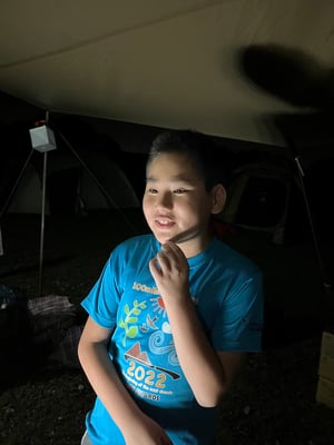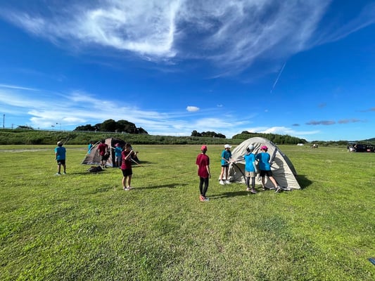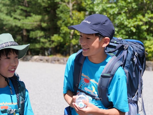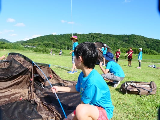 到着後はしばらくの休憩の後、これから10日間お世話になるテントの設営へ。高校生スタッフのレクチャーのもと、男子・女子に分かれて、自分たちの「寝床」を作り上げました。それが終わると、早速水辺で遊び出すメンバーたち。まだまだ体力には余裕があるようです。