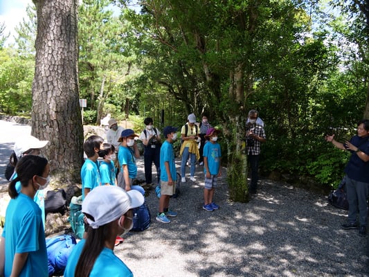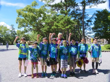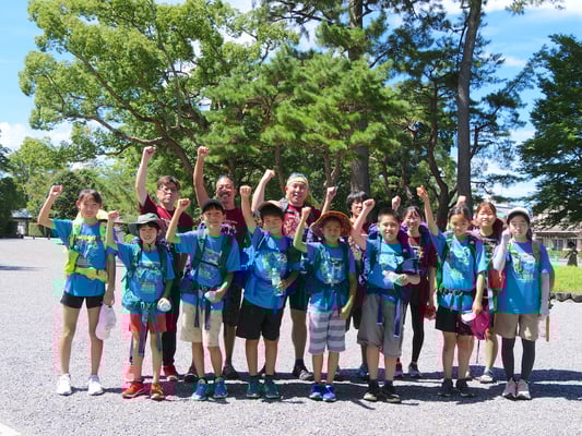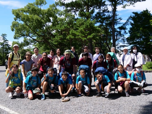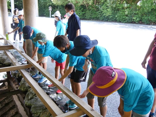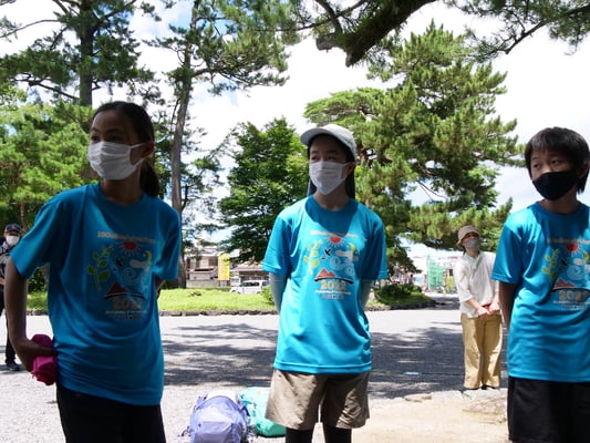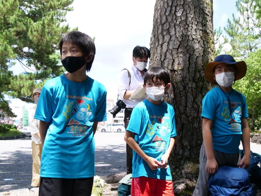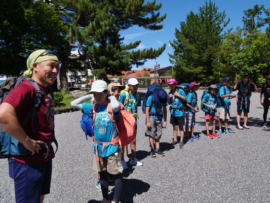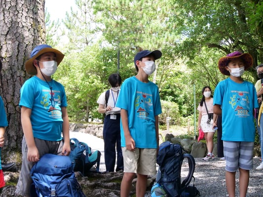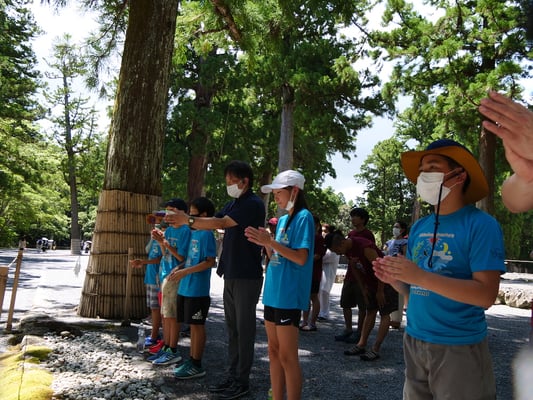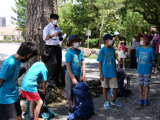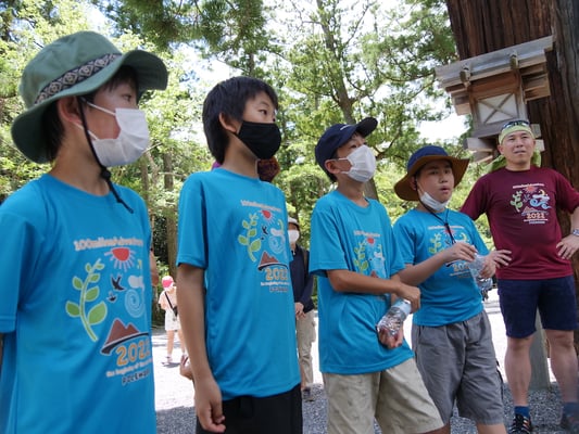 集合時間30分前の12時にスタッフが到着すると、既に数組のご家族の姿が。12時20分には全員が集合し、お揃いのユニフォームTシャツに着替え、簡単な自己紹介を済ませました。その後に集合写真を撮影、と例年はなるのですが、今回はスタート地点の伊勢神宮の関係者の皆様のご厚意で、境内へ。「豊受大神宮」を参拝し、旅の無事と成功を全員で祈願しました。その後も域内や「せんぐう館」をご案内いただいた一行は、再び集合地点へ。そこで100milesAdventure名物「直立不動の集合写真」を撮影し、家族のもとを離れ、京都駅までの11日間の旅路へ発ちました。