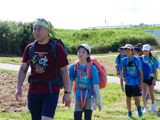 本日は初日と言うこともあり、行程は6km程度。もちろんまだ全員が徒歩行に慣れているわけではありませんが、出発から約1時間半後の15時半過ぎには、本日のキャンプ地「たまき水辺の楽校」に全員揃って姿を見せました。