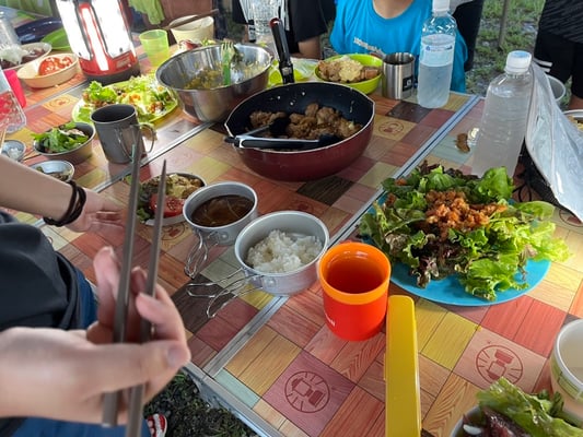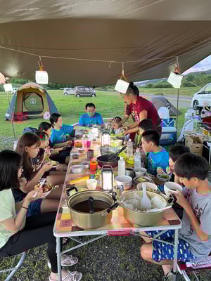 食事担当:大ちゃんの豪華な夕食をいただいた後、こちらも初日恒例の「自分は何者なのか自己紹介」を21時まで。自己紹介が終わると身の回りを片付け、自分たちのテントに戻って行きました。しばらくは笑い声なども聞こえていましたが、1時間もすると、すっかり静かになりました。