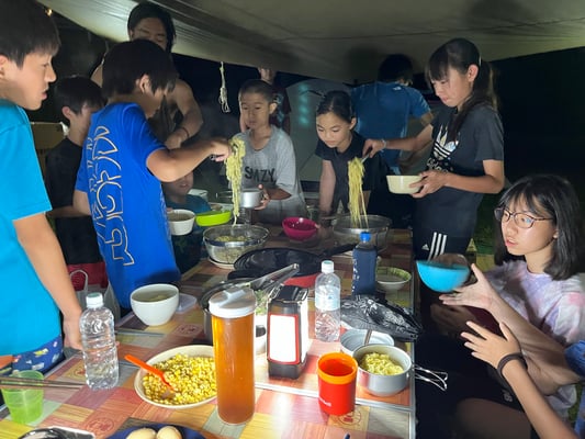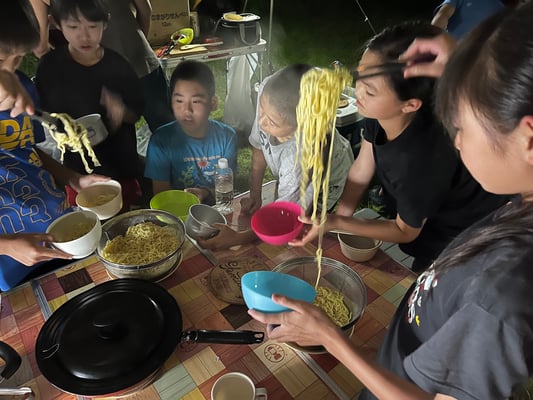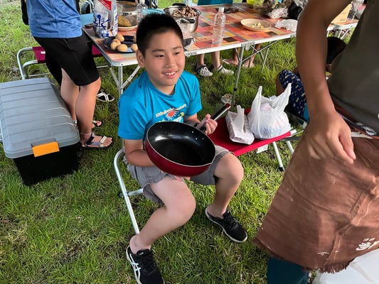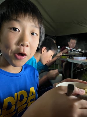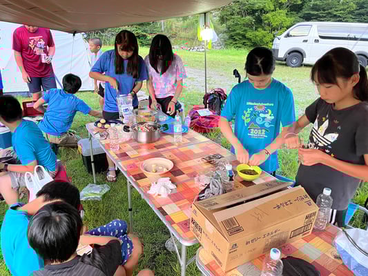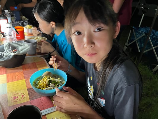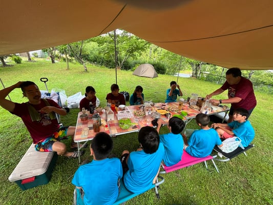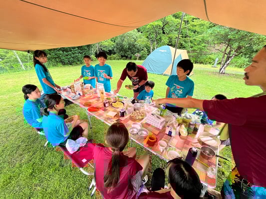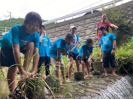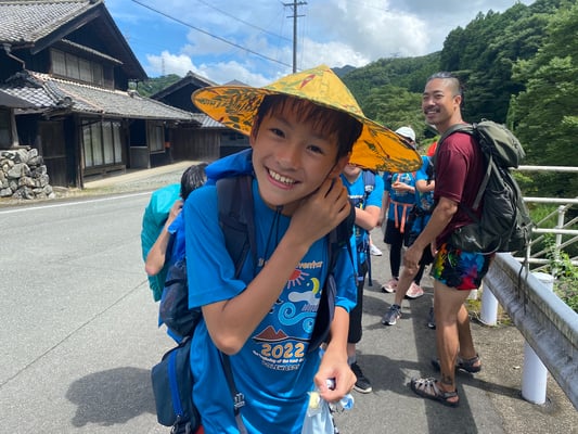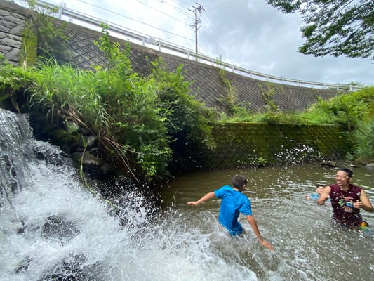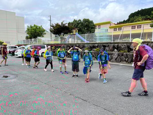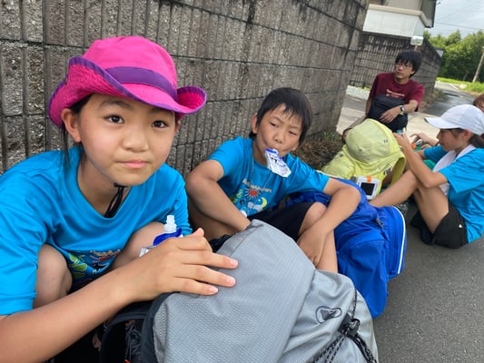 これまで同様通り雨は程なくして止み、休憩後には日差しが戻って来ました。これまで雨で体が濡れることが多かった一行ですが、この日は暑さをしのぐため、ルート上の川でしばしのクールダウン!リフレッシュしたメンバーたちは、この日の難所の峠を越え、予定通りの16時半にキャンプ場へ到着。コロコロと変わる天候、そして暑さと戦いながら、最長区間を踏破しました!