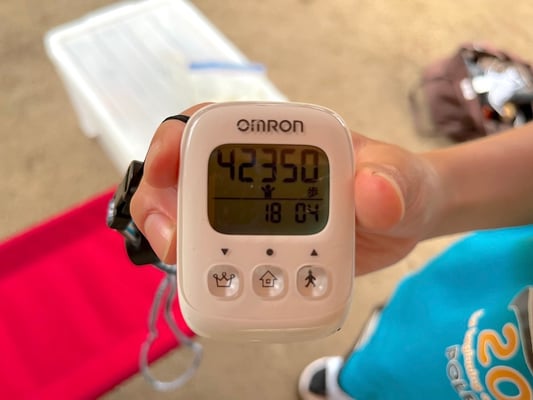 100milesAdventureを毎年応援してくださる皆様の中にはお気づきの方もいらっしゃるかと思いますが、今回の第1ルート初日より、その日の「歩数」を記すことにしています。これは100milesAdventure2021・第1ルートの先輩・ユイから託されたものです。昨年の行程中ユイ自身が歩数計を身に付けていて、とても良い記録になったとのこと。今年のメンバーたちにもその経験をしてもらいたいと、出発前に直接届けてくれました。