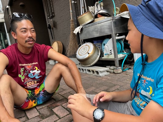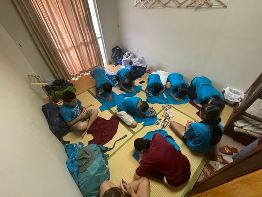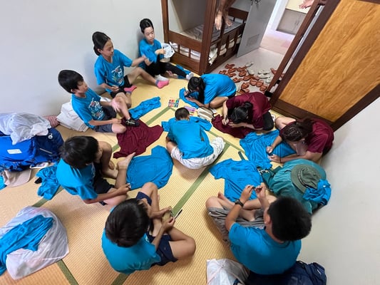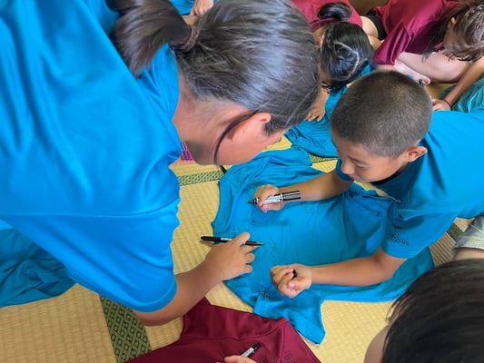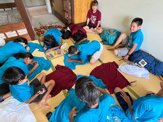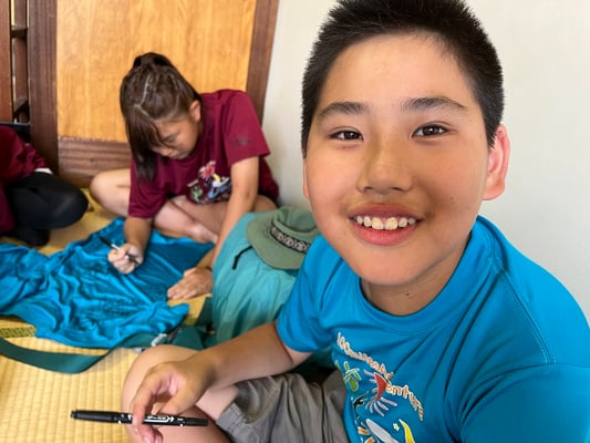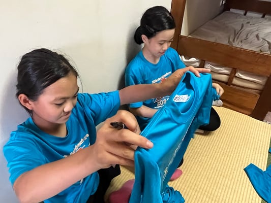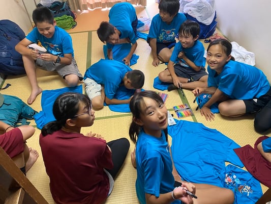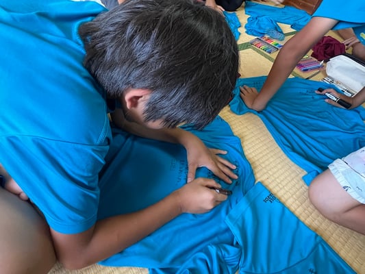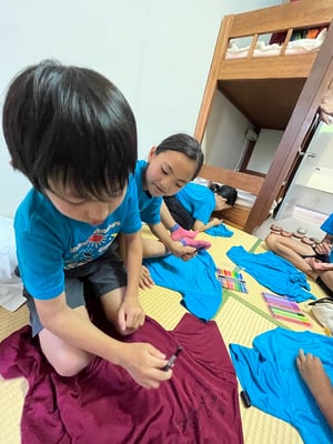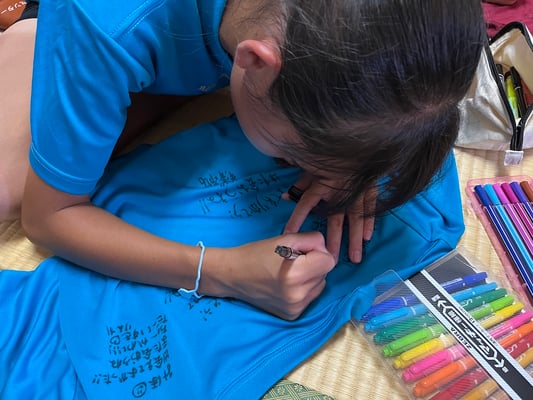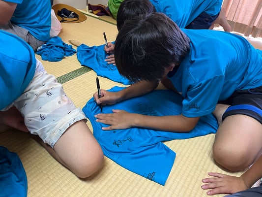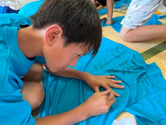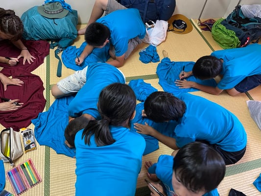 到着後はこれまた100milesAdventure恒例「Tシャツ寄せ書き大会」の始まり!一つの部屋に各々のTシャツを持ち寄り、10日間の旅のメッセージを書き合いました。