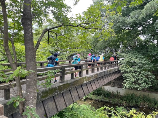 この日の移動は、宿泊先「青少年野外活動総合センター・友愛の丘」、までの19.2km。午前中だけで歩き切るのはチョット難しいですが、現在のメンバーたちの進行ペースを考えると、それほど時間の掛かる行程ではありません。正午前にはスタートから約13km地点の「玉水駅」に到着。駅の一角をお借りして、昼食休憩をとりました。